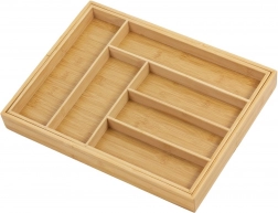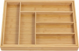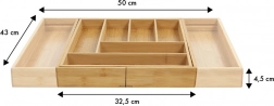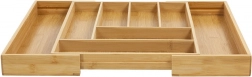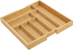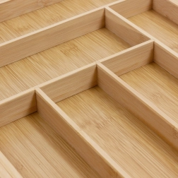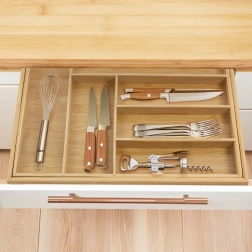 Održavajte red u kuhinji s univerzalnim bambusovim organizerom koji se prilagođava vašoj ladici. Proširive bočne strane stvaraju dodatni prostor, a zajedno s čvrstim razdjelnim pregradama sve ostaje pregledno na svom mjestu. Prirodni izgled od masivnog bambusa pristaje i modernim i klasičnim interijerima.