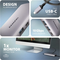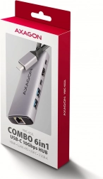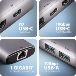 USB hub AXAGON HMC-6G2L 6-u-1 povećava mogućnosti vašeg uređaja za šest priključaka. Možete jednostavno povezati monitor, tri USB uređaja i gigabitnu mrežu preko dvostrukog USB-C. Hub nudi tri USB 10Gbps porta – dva s USB-A i jedan s USB-C. Zahvaljujući naprednom standardu USB 3.2 Gen 2 možete povezati brze uređaje poput NVMe M.2 diskova i postići brzine do 10 Gb/s.