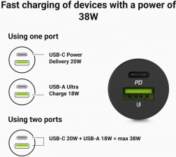 Otkrijte snagu i kompaktne dimenzije u jednom. Auto punjač GREEN CELL PowerRide Nano38 s ukupnom snagom 38 W kombinira USB‑C PD 20 W za moderne telefone i tablete te USB‑A 18 W Ultra Charge za brzo punjenje vaše opreme. Minimalistički dizajn s aluminijskom konstrukcijom savršeno se uklapa u interijer svakog vozila.