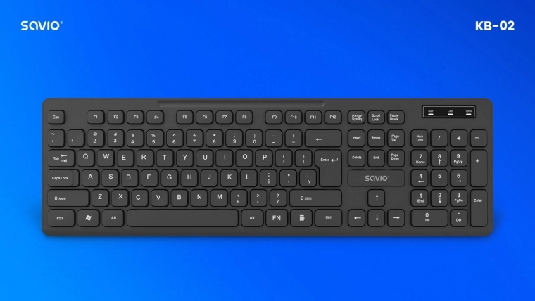 Uživajte u slobodi bez kabela i urednom radnom okruženju. Bežična tipkovnica Savio KB-02 na frekvenciji 2,4 GHz pruža stabilnu vezu bez kašnjenja i domet za ugodno upravljanje. Nizak profil tipki i tanko kućište osiguravaju udobno tipkanje i pri duljoj upotrebi.