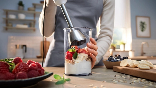 Sjeckalica i pjenjača proširuju mogućnosti pripreme – od nasjeckanog bilja do pjenastih krema. Mjerna posuda olakšava miješanje manjih porcija.