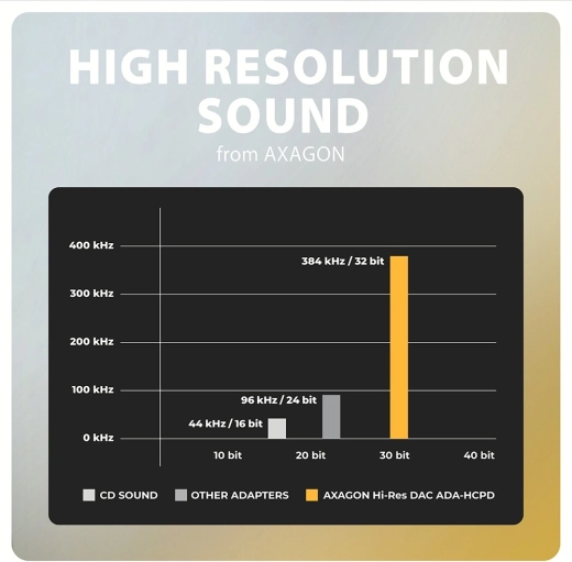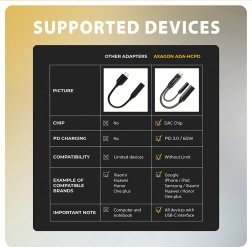 Vanjska zvučna kartica ADA-HCPD nije samo odlično rješenje za uređaje bez audio priključka, već zahvaljujući Power Delivery 3.0 snage do 60 W omogućuje istodobno punjenje pametnog telefona ili prijenosnog računala, čime vas oslobađa stalnog odspajanja slušalica. Uživajte u vrhunskom zvuku pri slušanju glazbe, gledanju filmova ili igranju igara. Ovaj adapter podržava bezgubitne formate poput FLAC, WMA, WAV, APE, AAC ili ALAC te je kompatibilan s platformama poput Spotifyja, Apple Musica i drugih.