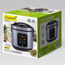 Multicooker MAESTRO MR-794 s kapacitetom 5 litara i snagom 900 W univerzalan je pomoćnik za kuhanje, prženje i pečenje. Nudi 30 programa, touch upravljanje, odgođeni start i održavanje topline do 24 sata. Izdržljiva konstrukcija od nehrđajućeg čelika i plastike, posuda s neljepljivim premazom i automatsko čišćenje jamče udobnost i jednostavno održavanje.
