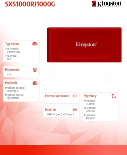 Vanjski SSD disk Kingston XS1000 1 TB USB 3.2 Gen 2, crveni