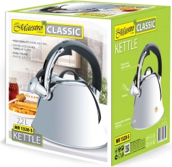 Čajnik Maestro 2,2 l spaja moderan dizajn s praktičnim funkcijama. Izrađen od nehrđajućeg čelika i plastike, ističe se svojom trajnosti i elegantnim izgledom. Ručka koja se ne zagrijava osigurava sigurnost pri uporabi, čime se smanjuje rizik od opeklina. Pisak signalizira kada voda proključa, što je praktično i sigurno rješenje za svakodnevnu uporabu.