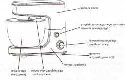 Dodatne funkcije uključuju automatsko zaustavljanje pri podizanju glave, blokadu miješalice i čvrste gumene nožice za stabilnost. Sigurnosna brava i zaštita od pregrijavanja osiguravaju dug vijek trajanja uređaja. Kabel je dug 105 cm, uređaj mjeri 13,5 cm u širinu, 28 cm u visinu i 28,5 cm u duljinu, s težinom od 5,25 kg.