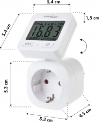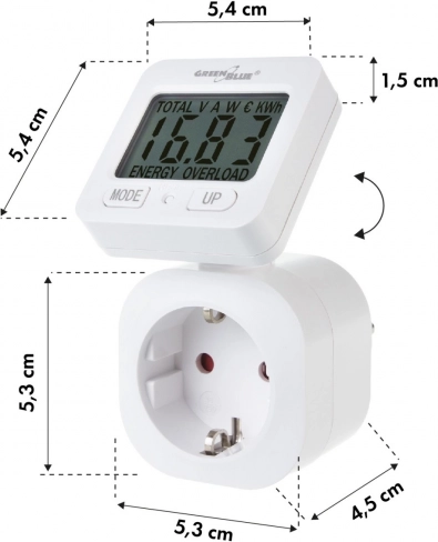 Upravljanje je intuitivno – dostupne su 2 funkcijske tipke za brzo prebacivanje režima. Rotirajući, dobro čitljiv zaslon osigurava izvrsnu vidljivost podataka u svakom položaju. Uređaj podnosi opterećenje do 3680 W, pa bez problema mjeri i zahtjevnije uređaje poput perilice rublja, sušilice ili računala.