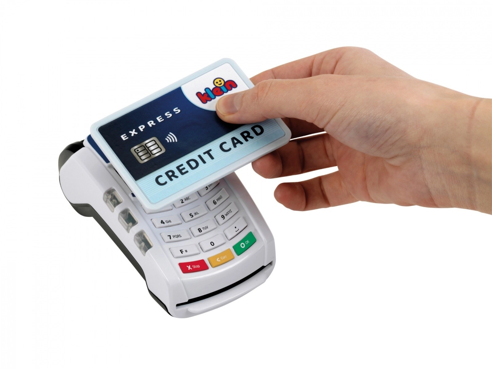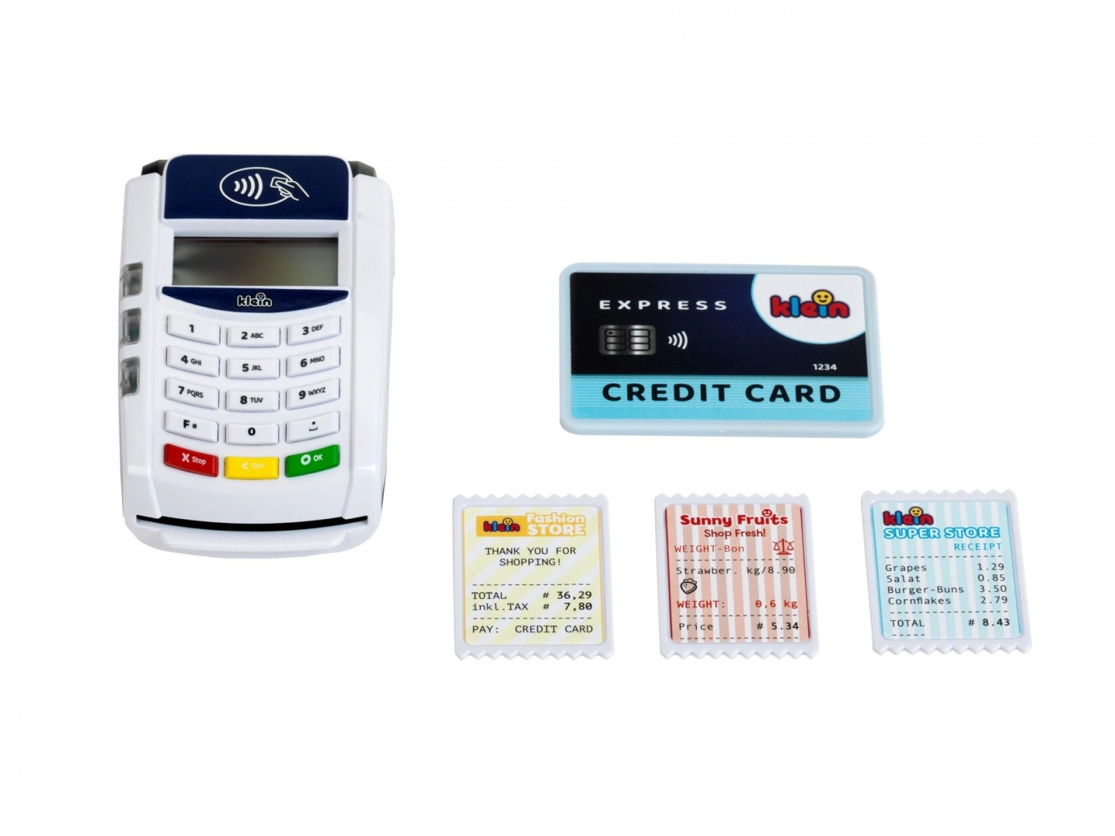 Platni terminal koji je izradila tvrtka Klein dolazi u bijeloj i plavoj boji s bijelim panelom tipkovnice. Igračka je izrađena od kvalitetne plastike i ima mnogo funkcija koje će se svidjeti svakom vlasniku male trgovine. Ovaj dodatak za dječju blagajnu donosi dašak moderne tehnologije u dječju sobu. Beskontaktna plaćanja ovdje postaju oblik igre, ali i oblik obrazovne stvarnosti.