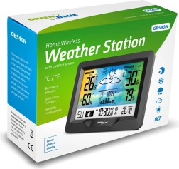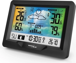 Moderna bežična meteorološka stanica GREENBLUE s kolor zaslonom, radio-kontroliranim vremenom DCF, unutarnjim i vanjskim mjerenjem temperature i vlažnosti, barometrom, mjesečevim fazama i grafičkom vremenskom prognozom. Zahvaljujući bežičnom senzoru prati uvjete do udaljenosti 60 m, a pokazatelj udobnosti okoline pomaže održati zdravi kućni klimat.