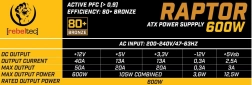 Napajanje Raptor se ističe na tržištu s vrhunskom rezervom snage zahvaljujući naprednoj konstrukciji i visokokvalitetnim komponentama. Na šini +12V učinkovito generira 600W za napajanje CPU-a i grafičkih kartica, dok za ostale linije pruža dodatnu snagu do ukupno 721W.<1/p>