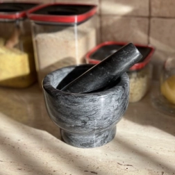 Mramorni mužar RUHHY pouzdan je pomoćnik za sve ljubitelje autentičnog okusa. Prirodni mramor osigurava dug vijek trajanja, otpornost na pukotine i ogrebotine te zahvaljujući svojoj težini pruža iznimnu stabilnost pri radu. Unutarnja, blago hrapava površina zdjele i tučka maksimizira trenje i jamči precizno usitnjavanje sastojaka bez nepotrebnog napora.