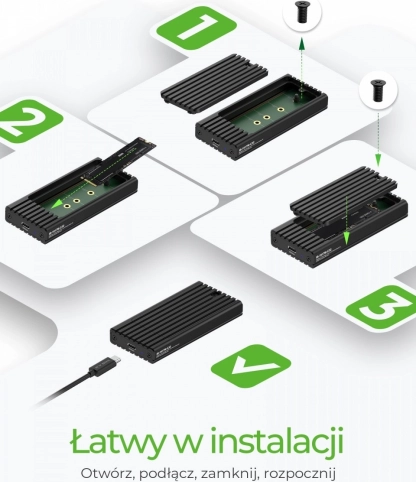 Zahvaljujući podršci duljina 30/42/60/80 mm dobivate univerzalno rješenje za većinu NVMe modula. Ugradnja je brza i praktična – nakon otpuštanja poklopca disk jednostavno učvrstite bez vijaka i možete početi raditi. Ultrakompaktno kućište stane u svaku torbu, pa su vam podaci uvijek pri ruci.