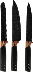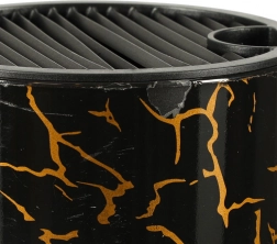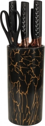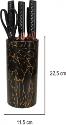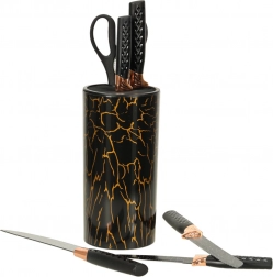 Otkrijte izniman dizajn s crnim i bakrenim akcentima koji unaprijeđuju izgled vaše kuhinje. Mramorni stalak pruža praktično i estetsko rješenje za pohranu koje održava vaše noževe organizirane i lako dostupne.