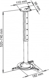 Univerzalni stropni držač za projektore s nosivošću do 15 kg. Nudi potpunu regulaciju uključujući nagib +15° do -15° i okretanje od 360°. Uključuje podesiv razmak montažnih otvora i sustav za sakrivanje kabela.