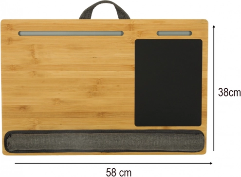 Elegantni drveni stolić za krilo kombinira udobnost, funkcionalnost i izdržljivost. Prirodna drvena ploča čvrsta je i ugodna na dodir, dok se mekano jastučasto dno prilagođava vašim koljenima i osigurava stabilnost bez klizanja. Ergonomski oslonac za zapešće smanjuje umor pri duljem radu na prijenosnom računalu.