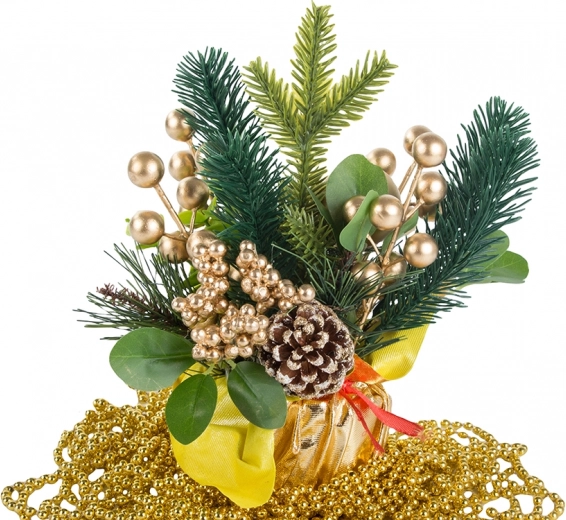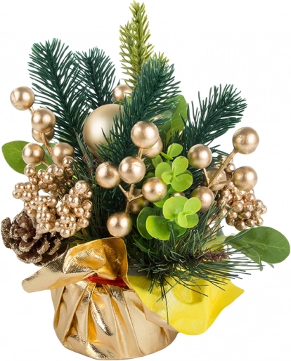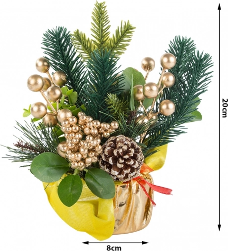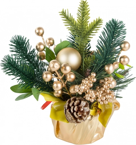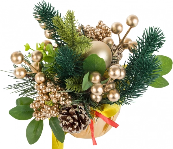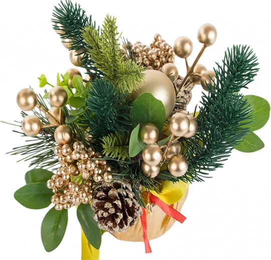 Ova božićna aranžmana donosi harmoniju tradicionalnih boja i materijala. Bogate zelene grančice, zlatne bobice i kuglice nadopunjuje prirodni češer smješten na stabilnoj zlatnoj bazi s mašnom. Ukras lijepo reflektira svjetlo i stvara ugodnu, svečanu atmosferu u dnevnoj sobi, blagovaonici ili uredu.