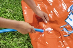 Brzo i jednostavno postavljanje. Dovoljno je razmotati tobogan na travnjak i priključiti crijevo. Posebni učvršćivači osiguravaju da tobogan ostane čvrsto na svom mjestu.