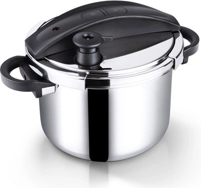Poklopac se otvara pritiskom na tipke jednom rukom, pa je rad u kuhinji brz i udoban. Ugrađeni manometar i višestupanjski sigurnosni ventili pružaju mir tijekom kuhanja, dok sendvič dno ravnomjerno raspoređuje toplinu na svim štednjacima, uključujući indukcijske ploče.