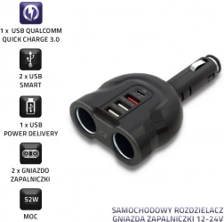 Proširite mogućnosti napajanja u svom automobilu. Razdjelnik Qoltec spaja moderan dizajn i funkcionalnost: dvije odvojene utičnice upaljača ostavljaju punu mogućnost korištenja autoopreme, dok USB priključci s podrškom za Quick Charge 3.0 i Power Delivery osiguravaju brzo i učinkovito punjenje vaših uređaja.