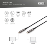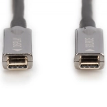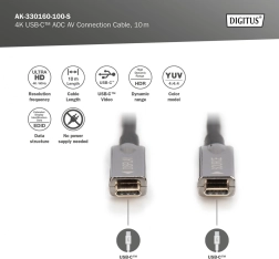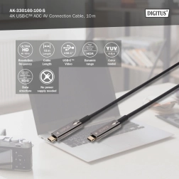 Aktivni hibridni USB‑C–USB‑C kabel za prijenos nekomprimirane slike i zvuka do UHD 4K @ 60 Hz s propusnošću do 21,6 Gbit/s. Zahvaljujući optičko‑bakarnoj konstrukciji lagan je, savitljiv i otporan na EMI, idealan za dulje trase (10 m). Podržava DisplayPort 1.2 i USB‑C DP Alt Mode, radi po principu plug and play bez vanjskog napajanja.