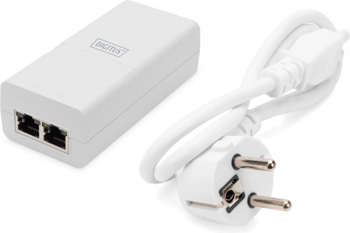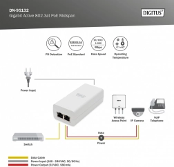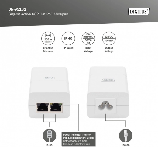 Aktivni midspan PoE injektor za unutarnju uporabu kombinira podatke i napajanje u jedan Ethernet kabel i značajno pojednostavljuje instalaciju mrežnih uređaja. Podržava IEEE 802.3at (PoE+) s unatrag kompatibilnošću s IEEE 802.3af, pruža izlaz 52 V DC / 0,58 A (do 30 W) i radi brzinama 10/100/1000 Mb/s. Dva RJ45 porta (LAN i PoE) omogućuju neometano napajanje i prijenos podataka na udaljenost do 100 metara preko kabela Cat5e/Cat6.