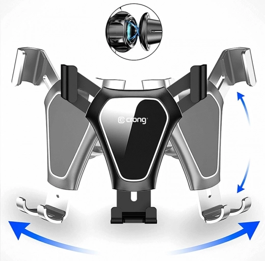 Praktičan gravitacijski držač za automobil za pametne telefone veličine 4,7–6,5" s učvršćivanjem na rešetku ventilacije. Zahvaljujući automatskom gravitacijskom zaključavanju telefon se nakon umetanja sam čvrsto učvrsti. Protuklizne umetke ublažavaju vibracije, okretna glava omogućuje postavljanje idealnog kuta, a tu je i mogućnost korištenja telefona u futroli do debljine 15 mm.