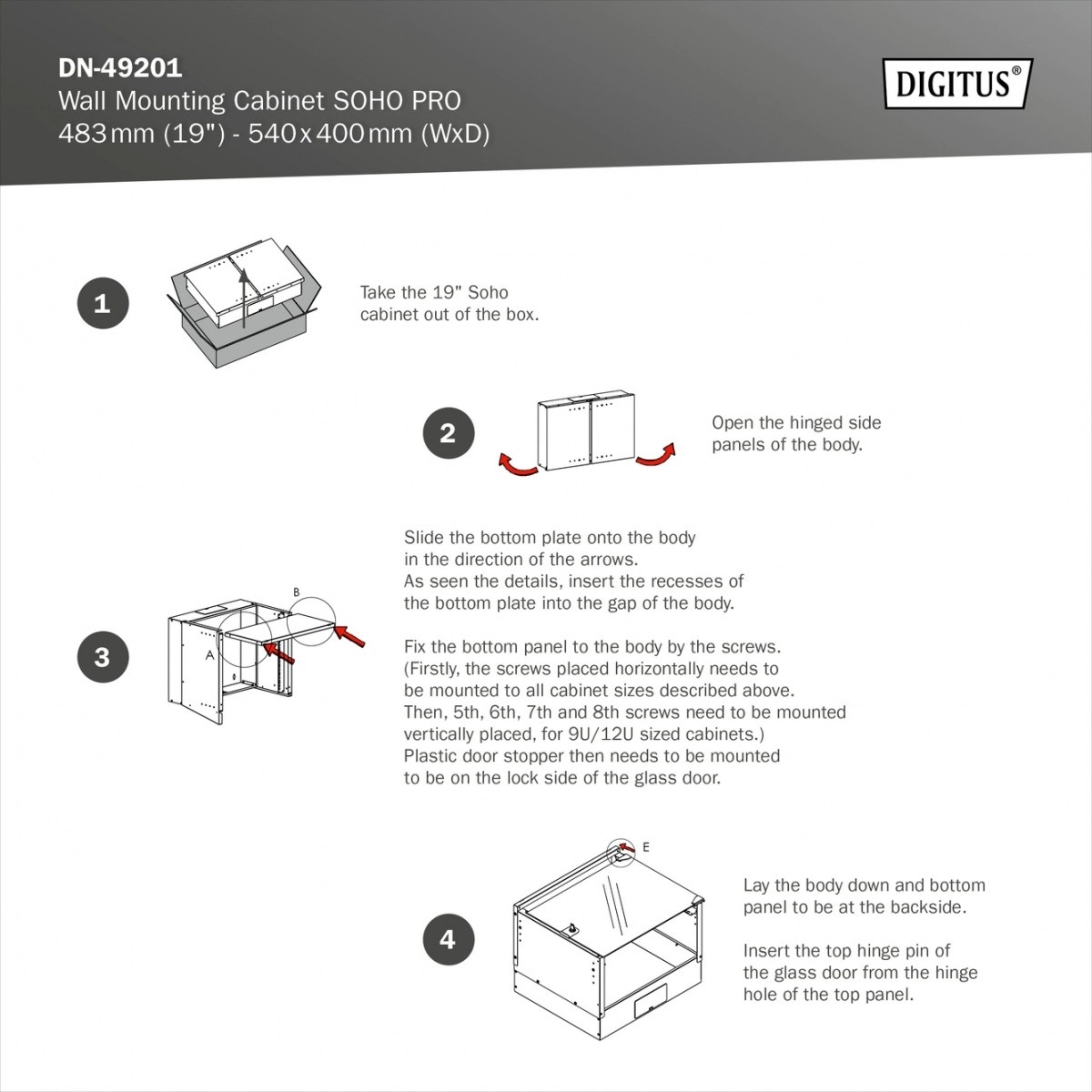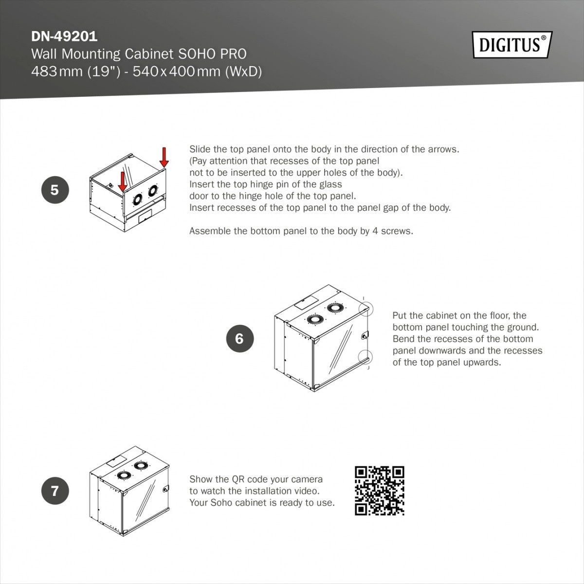 Zidni 19" ormar DIGITUS SOHO PRO idealan je za male server-sobe, urede i kućne mreže. Stabilno čelično kućište (1,1–1,5 mm) s praškastim lakiranjem jamči izdržljivost i dug vijek trajanja. Prednja staklena vrata sa bravom i kutom otvaranja do 200° omogućuju udoban pristup opremi.