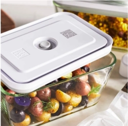 Vakuumsko pakiranje koje podsjeća na radost – čime nas još može iznenaditi ova neuobičajena vakuumska posuda ZWILLING Fresh & Save? Primjerice time što je prikladna za upotrebu u zamrzivaču, pećnici, mikrovalnoj pećnici i perilici posuđa. Dostupna je u tri veličine: S, M i L, pa se savršeno može prilagoditi potrebama i veličini jela ili namirnica koje želite pohraniti. Finih juha, hrskavih salata ili sve popularnijih zdjela s više sastojaka? Ukusnu, svježu i zdravu hranu možete uživati kad god poželite tijekom napornog tjedna. Jednim pritiskom na gumb vakuumske pumpe (kupuje se zasebno) možete iz unutrašnjosti ukloniti nepotreban zrak, čime osiguravate znatno dulju (čak pet puta dužu!) svježinu sadržaja. Otporna je na visoke temperature – do 180 stupnjeva – i idealna je za grijanje malih, pojedinačnih porcija jela. I još više? Inovativno rješenje, povezivanje proizvoda putem QR koda s posebnom besplatnom ZWILLING aplikacijom, koja vam omogućuje praćenje i podsjetnike roka svježine pohranjenih jela. Vakuumska posuda ZWILLING Fresh & Save olakšat će vam svakodnevicu omogućujući vam da jedete zdrave, svježe i redovite obroke tijekom cijelog dana.