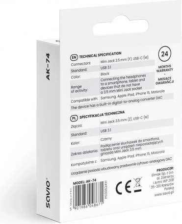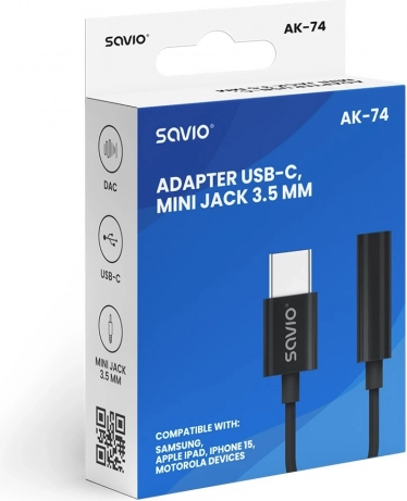 Audio adapter Savio s elegantnim crnim dizajnom savršeno se uklapa u svaki stil. Kompatibilan je sa širokim rasponom uređaja, uključujući pametne telefone i tablete renomiranih marki kao što su Samsung, Apple (iPad, iPhone 15 i 16) i Motorola. USB 3.1 standard osigurava brz i stabilan prijenos zvuka, što omogućuje neometanu reprodukciju glazbe, podcasta i telefonskih poziva na vašim omiljenim slušalicama.