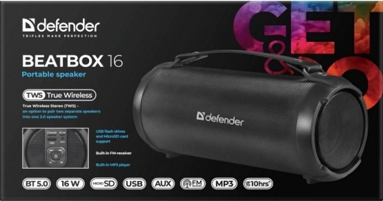 Uživajte u omiljenoj glazbi gdje god jeste uz zvučnik DEFENDER Beatbox 16. Valjkasto kućište s praktičnom ručkom lako se prenosi, a izdržljiva površina podnosi svakodnevnu upotrebu. Snaga od 16 W osigurava iznenađujuće snažan i uravnotežen zvuk za male zabave, trening ili opuštanje.