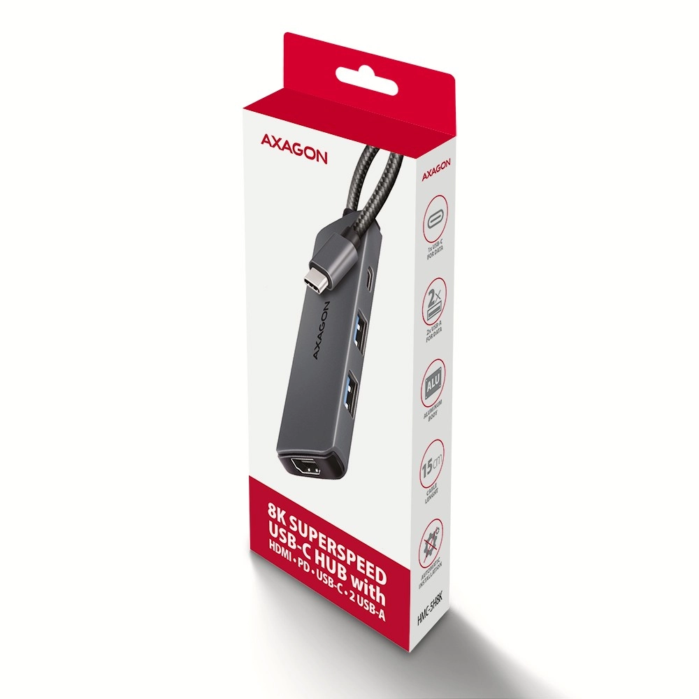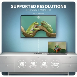 HDMI izlaz osigurava kvalitetnu sliku do rezolucije 8K/30Hz i 4K/120Hz Ultra HD, uključujući višekanalni zvuk. Podržane su visoke stope osvježavanja u popularnim gaming rezolucijama do 240Hz. Za ispravan rad potreban je USB-C ili Thunderbolt 3/4 port s aktivnim DisplayPort načinom (DP Alt Mode).