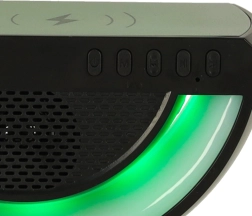 Moderna bežična stanica za punjenje s integriranim zvučnikom i zelenim LED svjetlima nudi stilski izgled koji odgovara današnjim tehnološkim trendovima.