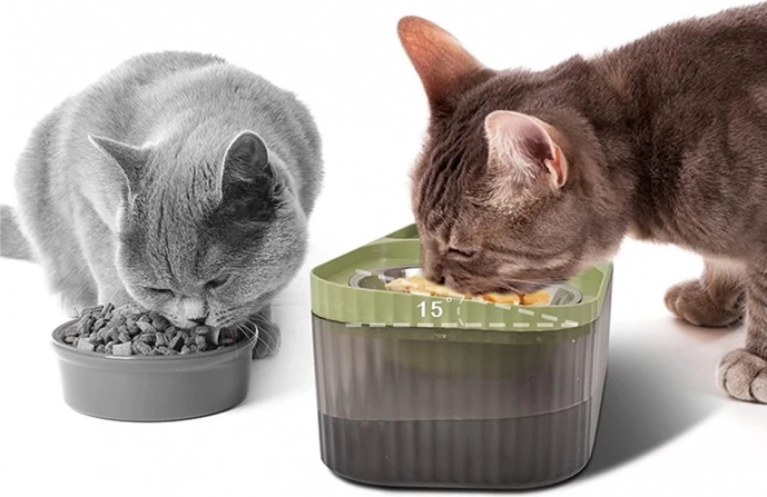 Praktična kombinacija fontane i zasebne posude za hranu štedi prostor i drži hranu i vodu na jednom mjestu.