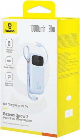 Kompaktna power banka BASEUS Qpow 2 s kapacitetom 10 000 mAh i snagom 30 W brzo puni telefon, tablet i slušalice. Ima ugrađene USB‑C kabele, više priključaka za istodobno punjenje te LED zaslon s točnim stanjem baterije. Idealna za putovanja zahvaljujući lakom i stilskom dizajnu te naprednim sigurnosnim zaštitama.