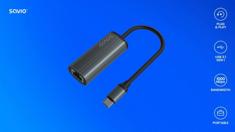 SAVIO USB‑C na RJ‑45 adapter idealan je izbor za prijenosna i stolna računala bez Ethernet priključka. Donosi stabilnu gigabitnu vezu za neometano streamanje, brzo preuzimanje i pouzdan online rad. Dovoljno ga je priključiti u USB‑C i odmah radi – bez instalacije upravljačkih programa.