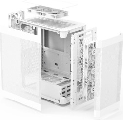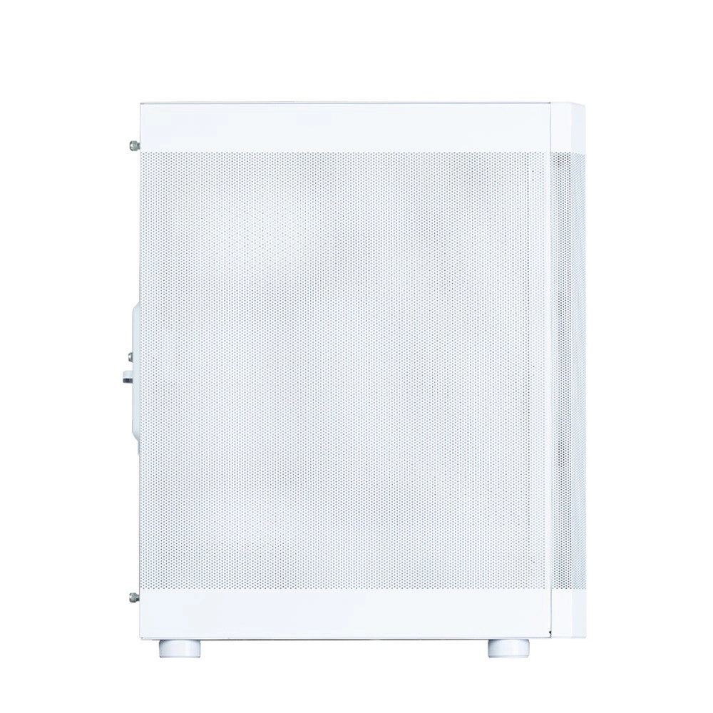 Elegantno bijelo ATX Mid Tower kućište s potpuno mrežastim panelima za maksimalan protok zraka i učinkovito hlađenje. Iz tvorničke isporuke opremljeno je s 6× 120 mm ventilatora (3× prednji, 2× gornji, 1× stražnji), s magnetskim filtrom prašine po obodu i praktičnim gornjim I/O panelom. Podržava visoke hladnjake CPU-a, duge grafičke kartice i okomitu montažu GPU-a te nudi čist, moderan dizajn s naglaskom na funkcionalnost.