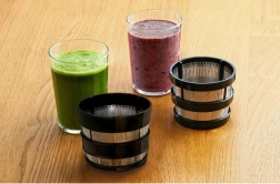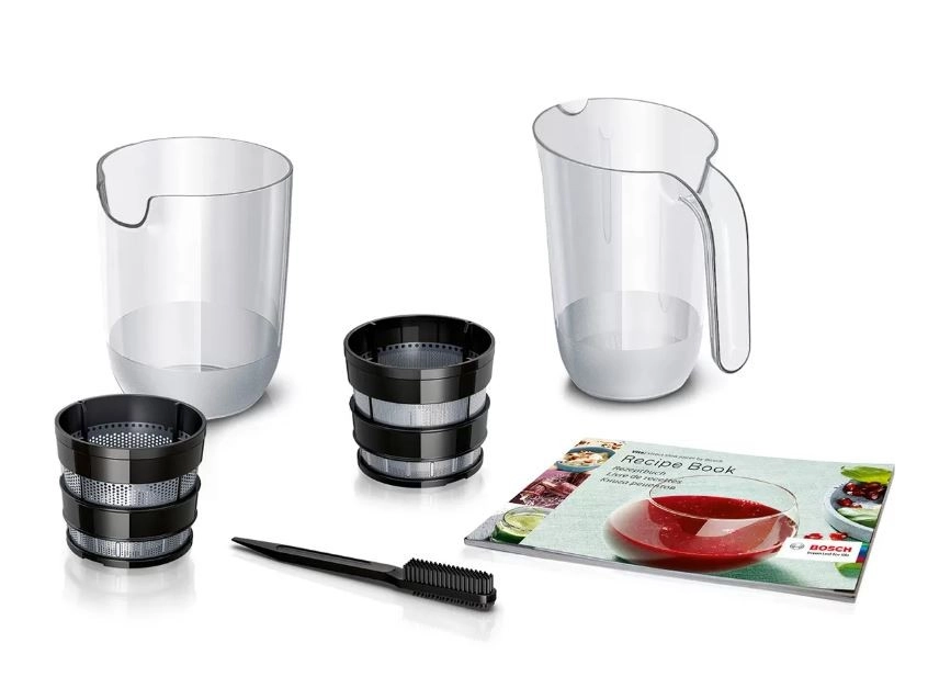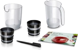 Svi plastični dijelovi koji dolaze u dodir s hranom su bez BPA i mogu se praktično prati u perilici posuđa. Izdržljiv, vrlo tih motor od 150 W s približno 55 okr./min osigurava visoki prinos soka uz minimalnu buku. U kompletu je i knjiga recepata puna ideja za sokove, smoothieje i zdrave napitke.