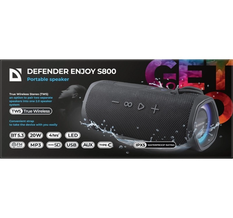 Uživajte u omiljenoj glazbi bilo gdje s DEFENDER Enjoy S800. Ovaj prijenosni zvučnik spaja snagu od 20 W s čistim i dinamičnim zvukom, upotpunjenim atraktivnim LED efektima. Zahvaljujući Bluetoothu brzo se povezujete s telefonom, tabletom ili prijenosnikom i streaming je trenutan.