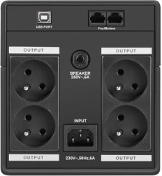 Četiri izlazne utičnice 230 V (tip E – francuske) omogućuju istodobno napajanje više uređaja. Pregledne LED lampice informiraju o stanju Backup/Normal/Overload, dok USB sučelje sa softverom PowerManager II nudi nadzor i sigurno isključivanje sustava.