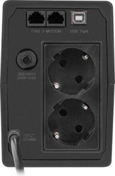 Dio opreme je AVR – automatska korekcija napona, koja izravnava kratkotrajne padove i prenapone u mreži, te RJ-11/RJ-45 zaštita za telefonske i podatkovne linije. Zaštita od preopterećenja štiti UPS i priključene potrošače, a tihi način rada minimizira zvučna upozorenja pri radu na bateriji – idealno za dnevni boravak ili radnu sobu.