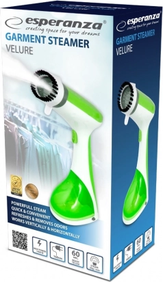 Parni uređaj za odjeću Esperanza Velure kompaktan je i jednostavan pomoćnik za glačanje i osvježavanje odjeće, zavjesa, presvlaka i deka. Spreman je za uporabu za samo 30 sekundi, i za vertikalnu i za horizontalnu primjenu.