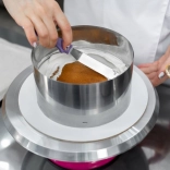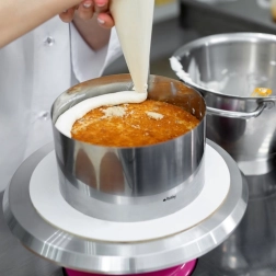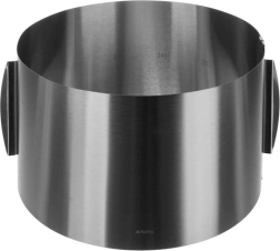 Profesionalni prsten za torte od nehrđajućeg čelika s kontinuiranom regulacijom promjera 16–30 cm i dodatnom visinom od 20 cm. Zahvaljujući čvrstim kopčama je stabilan, nepropustan i pogodan za visoke višeslojne torte. Jednostavno se podešava bez alata, odgovara svakoj pećnici i može se prati u perilici posuđa.