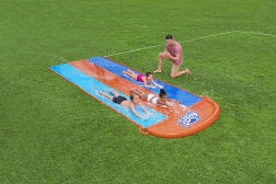 Započnite ljeto punom brzinom s BESTWAY vodenim toboganom duljine 4,88 m i tri trake za dječje utrke. Integrirane bočne prskalice održavaju površinu skliskom, dovoljno je priključiti vrtnu crijevo i zabava može početi. Izdržljiv PVC materijal, mekana završna zona i jednostavno puštanje u rad bez alata osiguravaju sigurne i beskrajne vodene radosti za djecu od 3 godine.