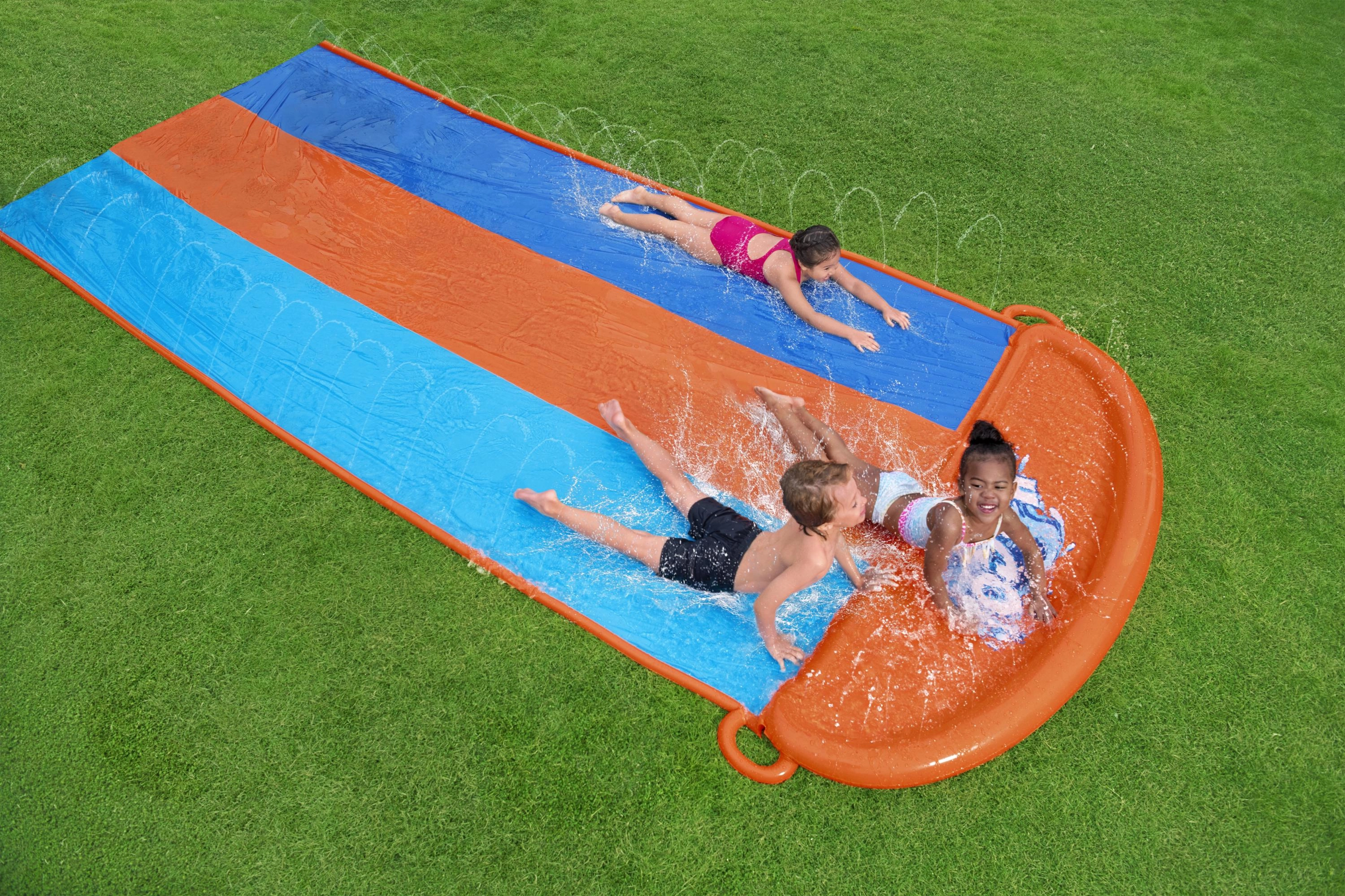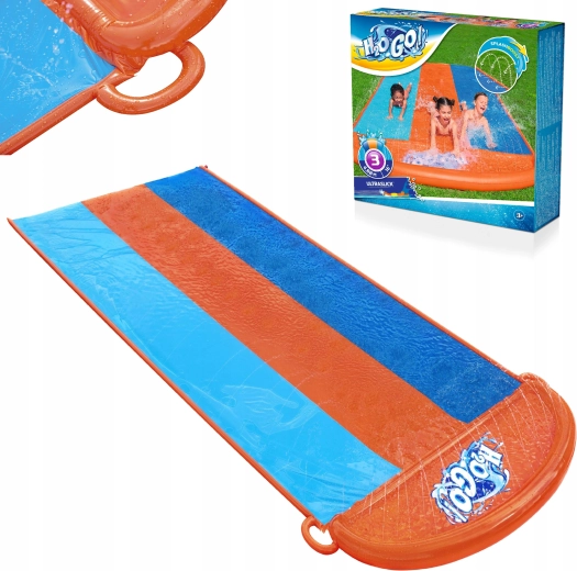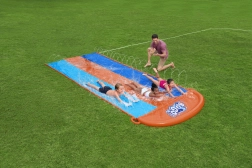 Organizirajte kućne vodene utrke izravno u vrtu. Trostruki tobogan BESTWAY nudi tri paralelne staze zahvaljujući kojima se djeca mogu natjecati rame uz rame. Bočne prskalice stvaraju nježnu vodenu kaskadu i održavaju površinu savršeno mokrom za brz i gladak skliz.