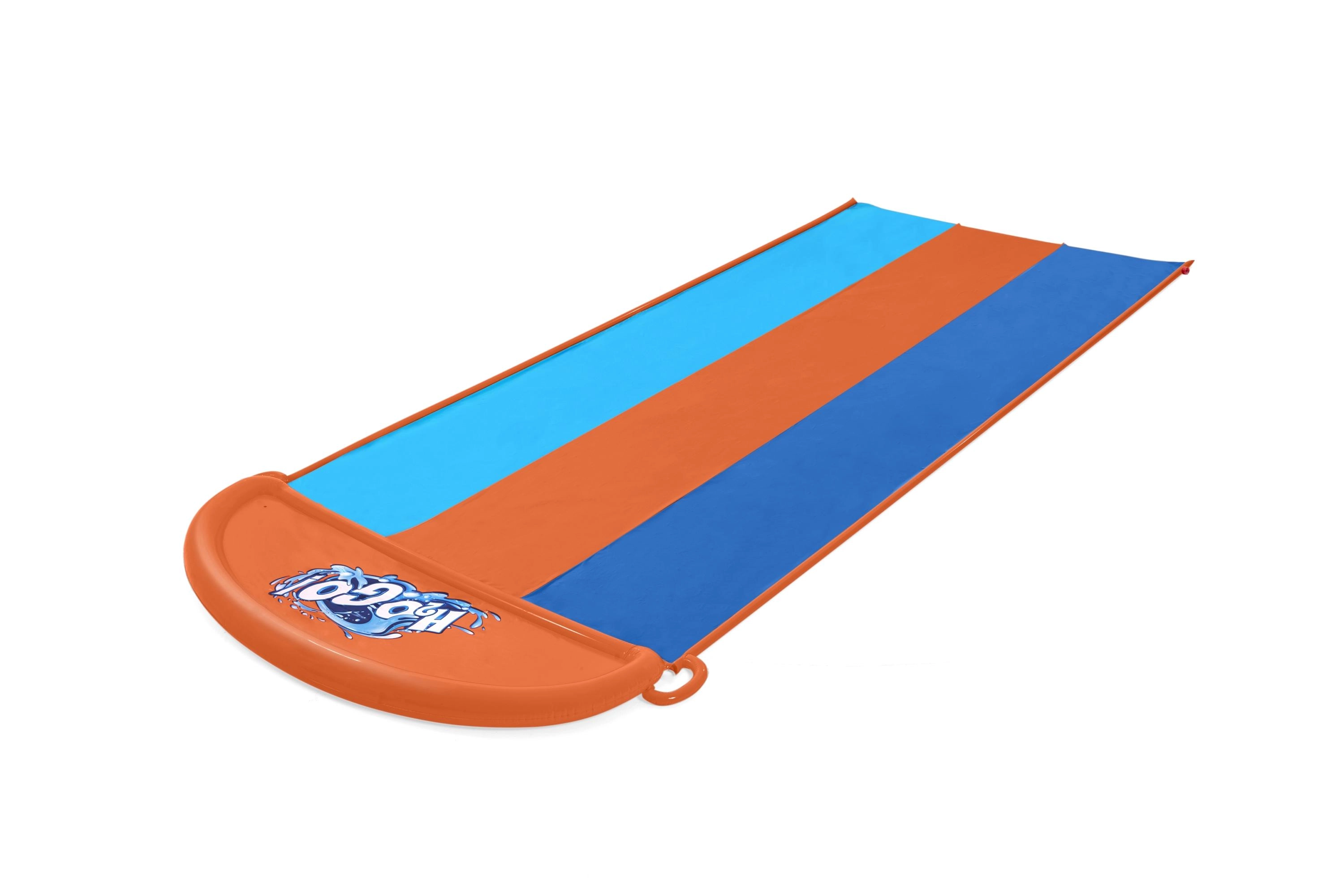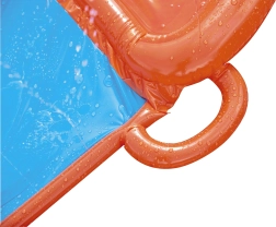 Instalacija traje svega nekoliko minuta – jednostavno priključite vrtnu crijevo i gotovo. Izdržljiv PVC debljine 0,2 mm, sigurnosni ventili i mekana završna zona povećavaju udobnost i sigurnost pri doskoku. U pakiranju se nalazi i zakrpa za popravak za brzo rješavanje manjih nezgoda.