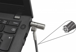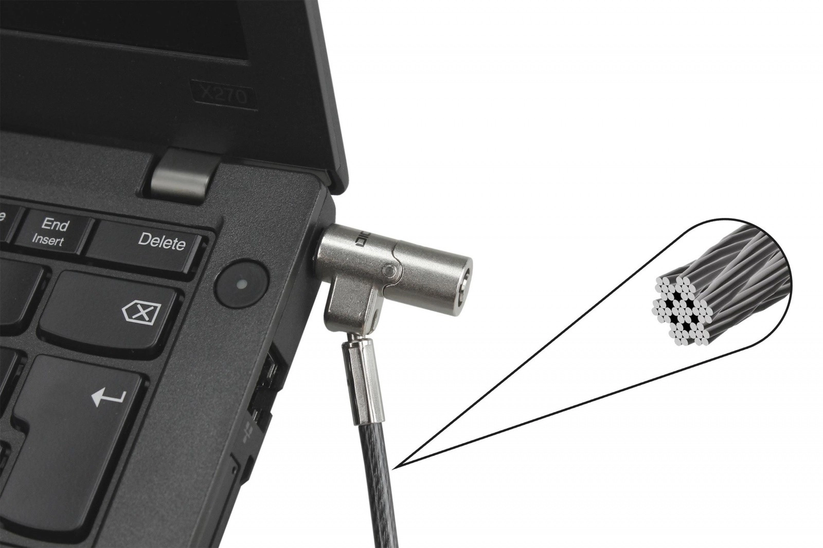 Brzo i učinkovito osigurajte svoj tanki laptop. Ova Nano Ultra Slim brava kompatibilna je s utorom 2,5 × 6 mm i dizajnirana za uređaje s glavom brave većom od 11 mm. Vižično čelično uže s PVC premazom pruža visoku otpornost na presijecanje, dok gumeni odbojnik štiti površinu uređaja.