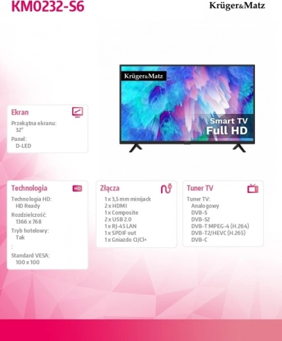 Uživajte u omiljenim filmovima, serijama i videima na kompaktnom 32" pametnom televizoru s HD rezolucijom. Nudi moderan tuner DVB‑T2/S2 s podrškom za HEVC (H.265), pametne funkcije za streamanje i bogate mogućnosti povezivanja kako bi gledanje sadržaja bilo jednostavno i udobno.