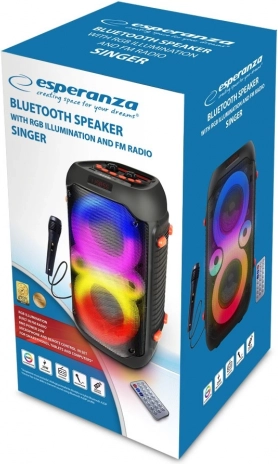 Zvučnik ESPERANZA Karaoke Singer opremljen je ugrađenim FM radijem, što omogućuje slušanje vaših omiljenih radio postaja. Dva mikrofonska ulaza čine ovaj uređaj savršenim izborom za karaoke zabave. Pomoću daljinskog upravljača možete jednostavno upravljati postavkama bez pristupa samom uređaju. Snažan zvuk i učinkovito LED osvjetljenje pružaju nezaboravno iskustvo kod kuće i na otvorenom.