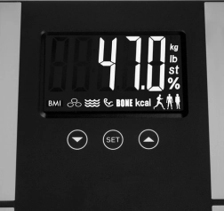 Upravljanje je maksimalno jednostavno: gumb SET i strelice za unos dobi (18–80 godina), visine (100–220 cm) i razine aktivnosti 1–5, odabir profila žena/muškarac/sportaš te praktično prebacivanje jedinica kg/lb/st gumbom UNIT na donjoj strani. Nakon mjerenja vaga se automatski isključuje nakon 60 s, štedi bateriju i ostaje spremna za sljedeću upotrebu.