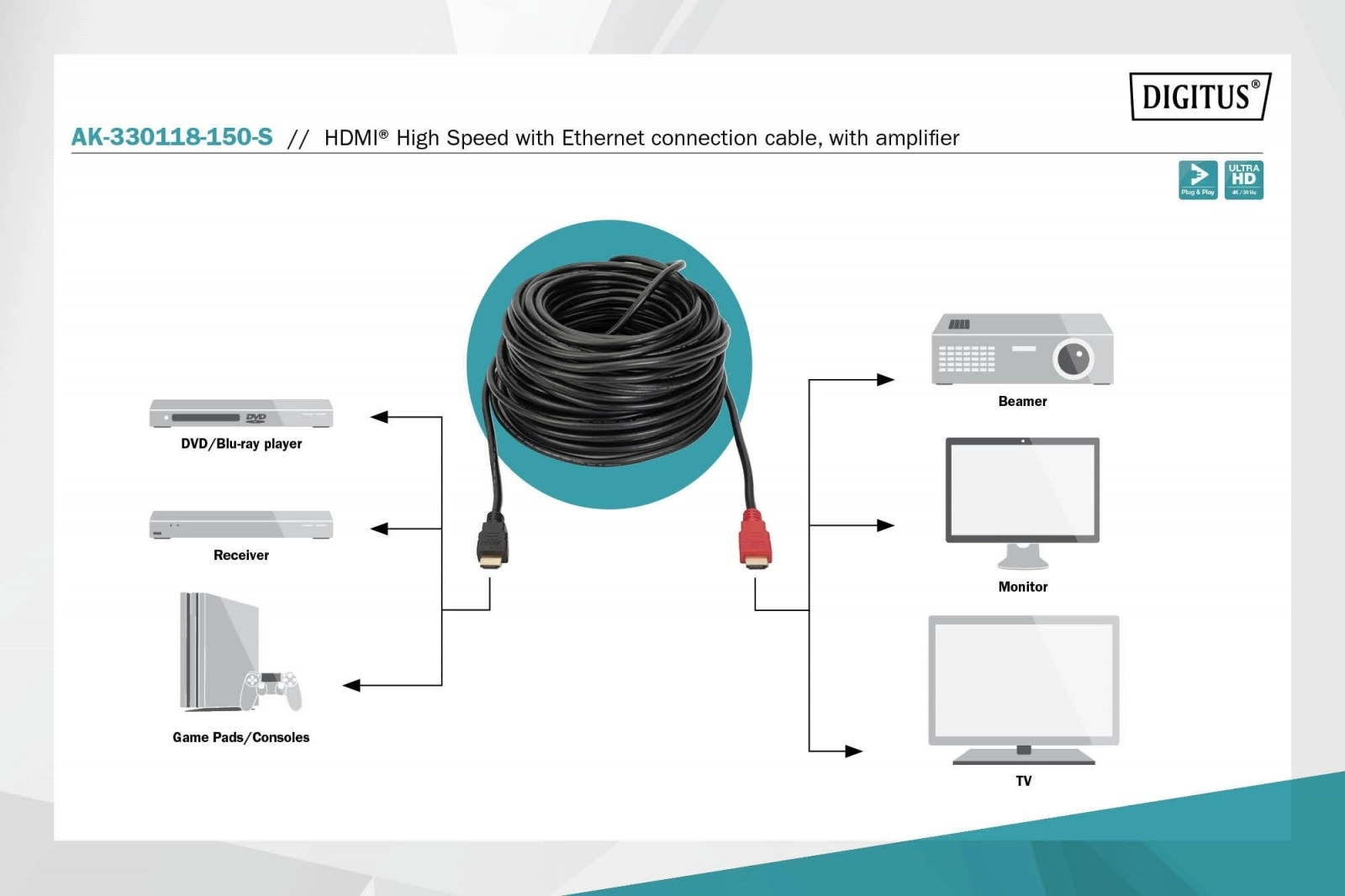 Ovaj aktivni i usmjereni HDMI kabel idealan je za povezivanje računala, igraćih konzola (npr. PS4), Blu‑ray/DVD reproduktora i drugih uređaja s televizorima, monitorima ili projektorima. Ugrađeno pojačalo održava stabilan prijenos na duljini od 15 m, pa dobivate oštru sliku i kvalitetan prostorni zvuk bez smetnji.